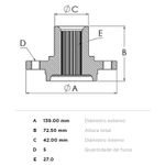Cubo das rodas do eixo dianteiro. Propriedades: - Diâmetro externo (DE) de 139,00mm; - Altura total de 72,50mm; - Diâmetro interno (DI) de 42,00mm; - Cubo com 5 furos; - Estrias: 27; Observação: - Utilizam-se 02 por veículo; - Não acompanha parafusos/porcas de roda;