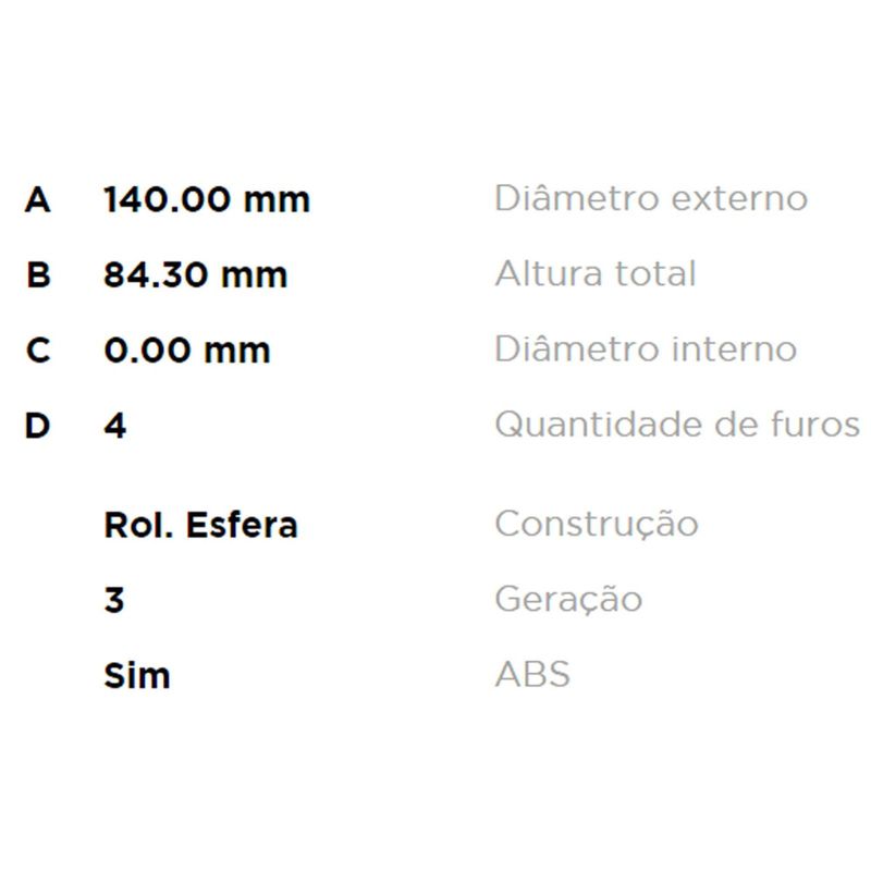 Cubo com rolamento das rodas do eixo traseiro. Propriedades: - Diâmetro externo (DE) de 140,00mm; - Altura total de 84,30mm; - Cubo com 4 furos; - Rolamento esfera; Observação: - Utilizam-se 02 por veículo; - Não acompanha parafusos/porcas de roda;