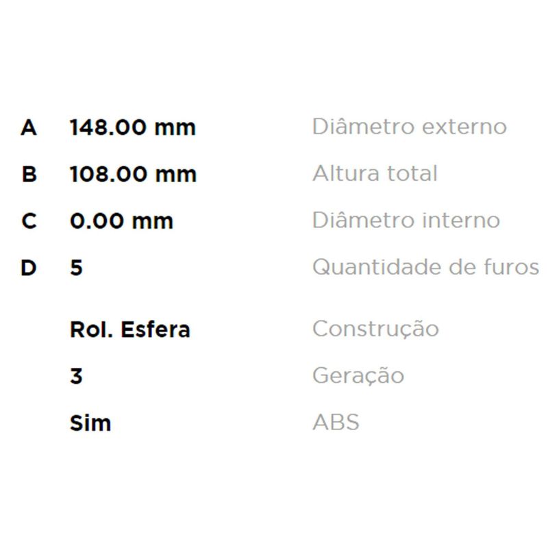 Cubo com rolamento das rodas do eixo traseiro. Propriedades: - Diâmetro externo (DE) de 148,00mm; - Altura total de 108,00mm; - Cubo com 5 furos; - Rolamento esfera; Observação: - Utilizam-se 02 por veículo; - Não acompanha parafusos/porcas de roda;