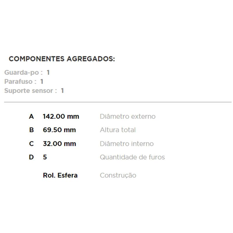 Cubo com rolamento das rodas do eixo traseiro. Propriedades: - Diâmetro externo (DE) de 142,00mm; - Altura total de 69,50mm; - Diâmetro interno (DI) de 32,00mm; - Cubo com 5 furos; - Rolamento esfera; Observação: - Utilizam-se 02 por veículo; - Não acompanha parafusos/porcas de roda;
