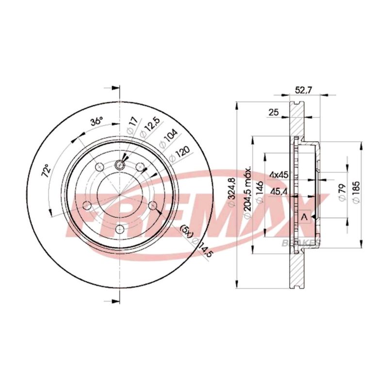 Par de discos de freio ventilado dianteiro. Propriedades: - Sem cubo; - Disco ventilado; - Diâmetro total (DT) de 325,00mm; - Espessura da pista de 25,00mm; - Espessura mínima de 23,40mm; - Altura total de 52,50mm; - Diâmetro total do furo de 79,00mm; - Quantidade de 5 furos; Observação: - Utiliza-se 01 jogo por veículo.