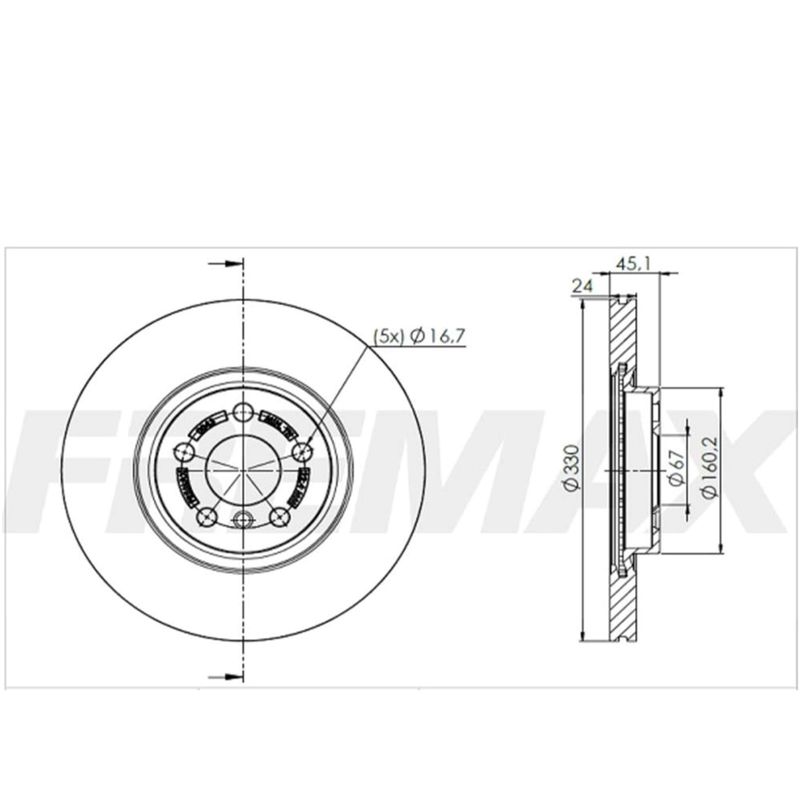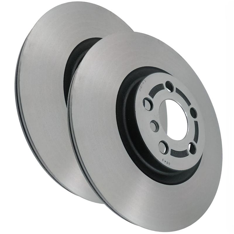 Par de discos de freio ventilado dianteiro. Propriedades: - Diâmetro total (DT) de 330,00mm; - Espessura da pista de 24,00mm; - Espessura mínima de 22,40mm; - Altura total de 45,20mm; - Diâmetro total do furo de 67,00mm; - Quantidade de 5 furos; Observação: - Sem cubo; - Disco ventilado; - Utiliza-se 01 jogo por veículo.