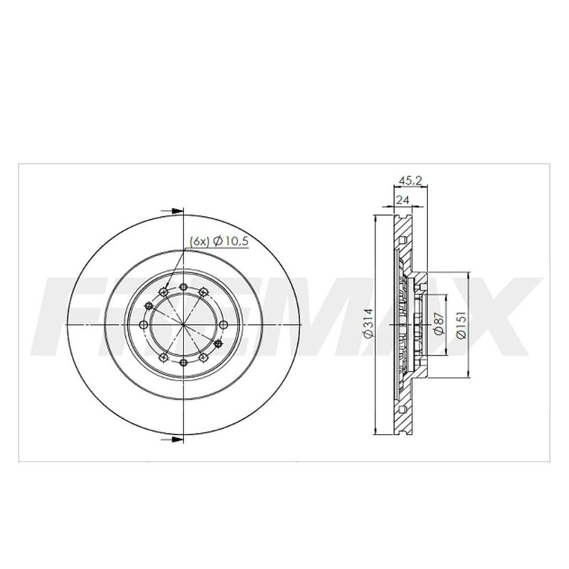 Par de discos de freio ventilado dianteiro. Propriedades: - Sem cubo; - Disco ventilado; - Diâmetro total (DT) de 314,00mm; - Espessura da pista de 24,00mm; - Espessura mínima de 22,40mm; - Altura total de 45,50mm; - Diâmetro total do furo de 87,00mm; - Quantidade de 6 furos; Observação: - Utiliza-se 01 jogo por veículo.