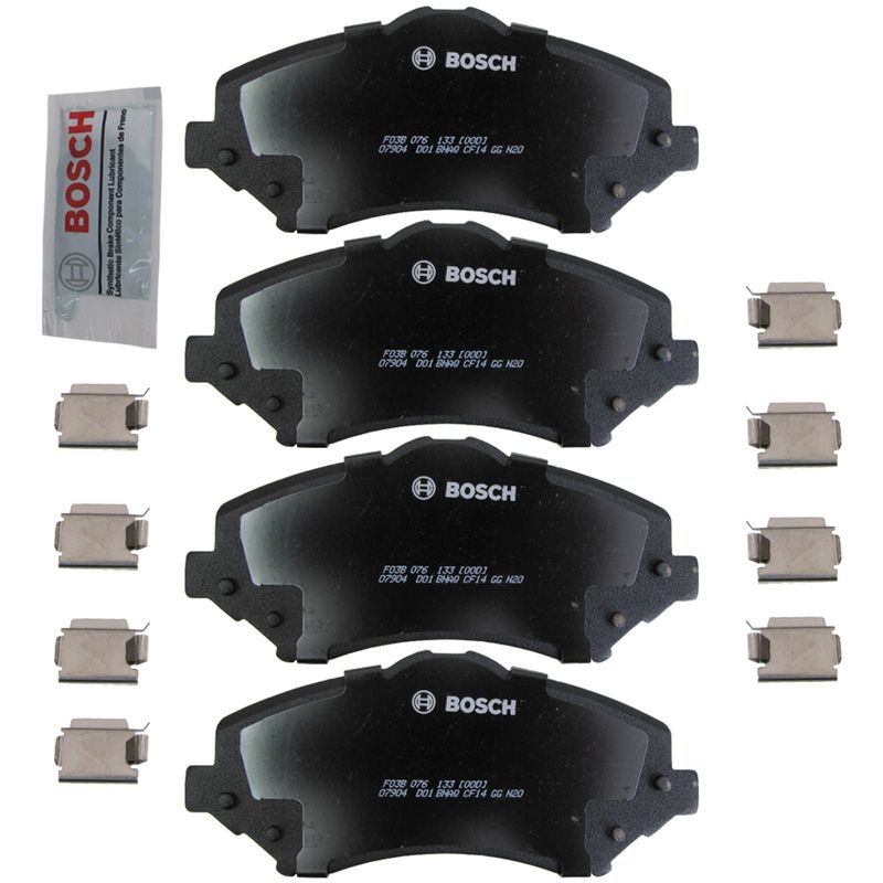 Jogo de pastilhas de freio dianteira de cerâmica. Propriedades: - comprimento: 146,60mm; - largura: 63,50mm; - espessura: 16,50mm; - sem sensor. As pastilhas de freio a disco QuietCast T da Bosch, desenvolvidas para o generalista que trabalha em todas as marcas e modelos durante todo o dia, esta linha premium eleva a tecnologia das pastilhas de freio de pós-venda a um nível totalmente novo. - Material de fricção avançado, específico da plataforma, sem cobre. - Ruído e vibração minimizados para o máximo conforto de condução são garantidos por um material de atrito superior combinado com calços de várias camadas. - Calço de núcleo de borracha pré-fixado, estilo OE para redução de ruído notável. - Desgaste de atrito reduzido e baixa emissão de poeira. - Camada protetora de transferência aumenta a vida útil da almofada e do rotor. - Redução da poeira dos freios significa discos mais limpos por mais tempo. - A redução do desgaste da pastilha e do disco de freio garante uma vida útil mais longa dos componentes do sistema de freio.