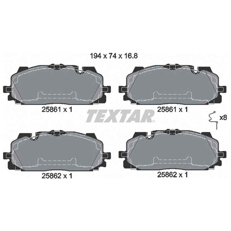 Jogo de pastilhas de freio dianteira. Propriedades: - Comprimento de 194,00mm; - Largura de 74,00mm; - Espessura de 16,80mm; - Sistema de trava Akebono; - Sem sensor.