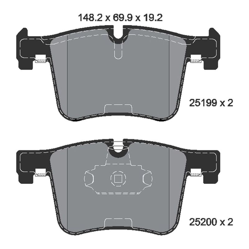 Jogo de pastilhas de freio dianteiras. Propriedades: - Comprimento: 148,20mm; - Largura: 69,90mm; - Espessura: 19,20mm; - Sistema de trava Bosch; - Sem sensor.