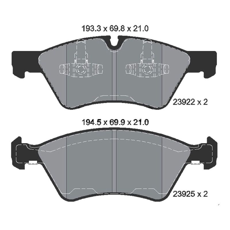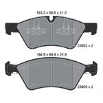Jogo de pastilhas de freio dianteiras. Propriedades: - Comprimento de 193,30mm; - Largura de 69,80mm; - Espessura de 21,00mm; - Sistema de trava Teves.
