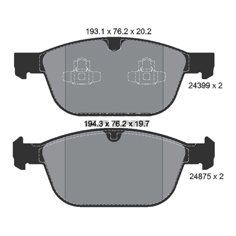 Jogo de pastilhas de freio dianteiras. Propriedades: - Comprimento de 193,30mm; - Largura de 76,20mm; - Espessura de 20,20mm; - Sistema de trava Teves. Observação: - Aplica somente para modelos com o primeiro tipo de pinça (DOIS PISTÕES), com disco dianteiro de 17"; - Utiliza-se 01 jogo por veículo.