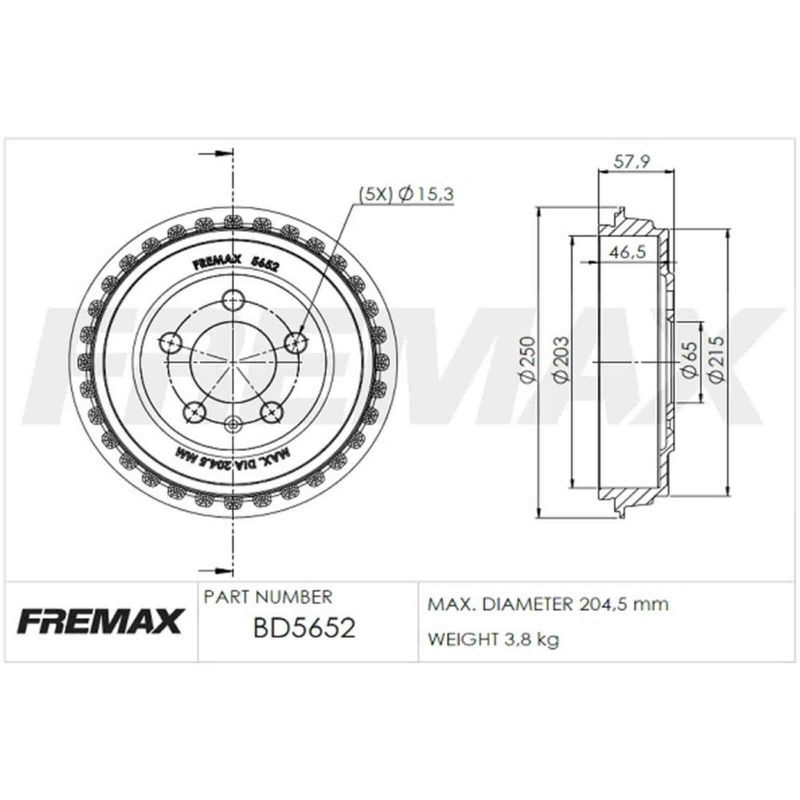 Par de tambores de freio traseiro. Propriedades: - Sem cubo; - Diâmetro interno: 203mm; - Diâmetro interno máximo: 204,5mm; - Diâmetro externo: 250mm; - Altural total: 57,9mm; - Diâmetro furo total: 65mm; - Quantidade de 5 furos.
